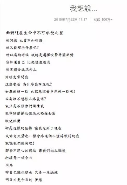 当时,张韶涵发表了一篇《我想说》文章,写道“面对这些生命中不可承受之重,我哭过,不知所措过,但又能怎么解决?...那些不开心的过往,让我们抛之脑后”。