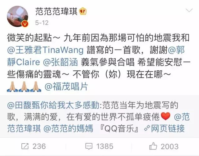 2017年,5月份范玮琪主动@了张韶涵,让所有人吓一跳。评论不出意外,不少人说范玮琪蹭热度。