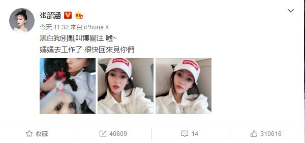 隔天,张韶涵发微博:“黑白狗別乱叫博关注 嘘~ 妈妈去工作了很快回来见你们。”被网友猜测是在回应素有“黑白配”之称的范玮琪夫妇。