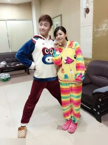 睡衣趴,两人穿的萌萌哒合照,陈晓直接大劈叉配合陈妍希拍照