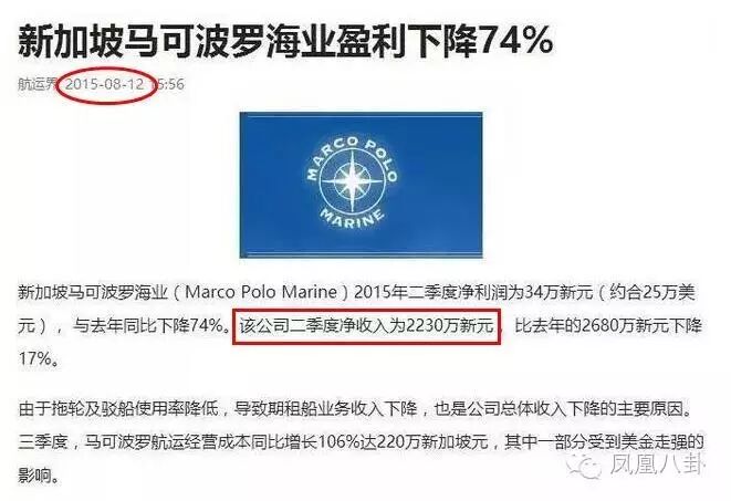 根据去年马可波罗海业两季度净收入2230万新元(人民币1亿)来算,在一年内偿还9亿,的确是很困难的事情。更别说今年国际油价大跌,整体海业都持续低迷的情况了。