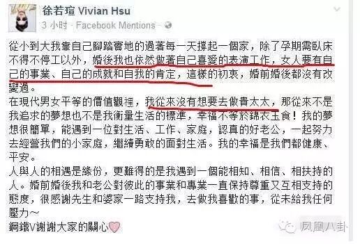面对大家的关心,徐若瑄也在脸书上发表了长文说从小到大都靠自己脚踏实地的过着每一天撑起一个家,自己从来没有想要去做贵太太,女人要有自己的事业,自己的成就和自我的肯定。