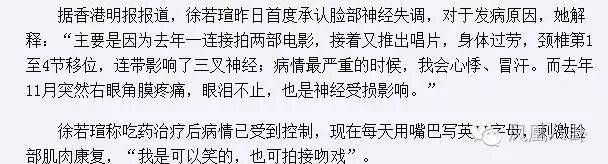 后来徐若瑄承认自己是因为过度劳累换上了面部神经失调,颈椎也发生移位,只能靠吃药和每日锻炼来刺激脸部肌肉的康复。