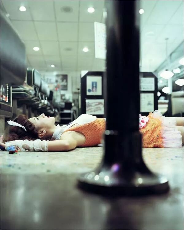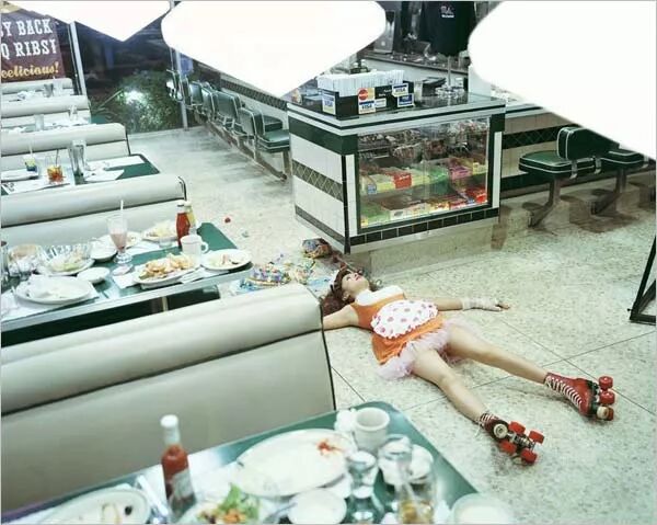 画面中面色苍白的女模特身着奢侈品牌服装,呈现出不同的死亡状态。故事情节都是虚拟的,作品似乎在讲述着那些永远不会被揭示的迷。模特们的呆滞的眼睛,不会再向任何人和事物睁开。象征性的表达面对死亡和继续生活在那断裂的刹那。