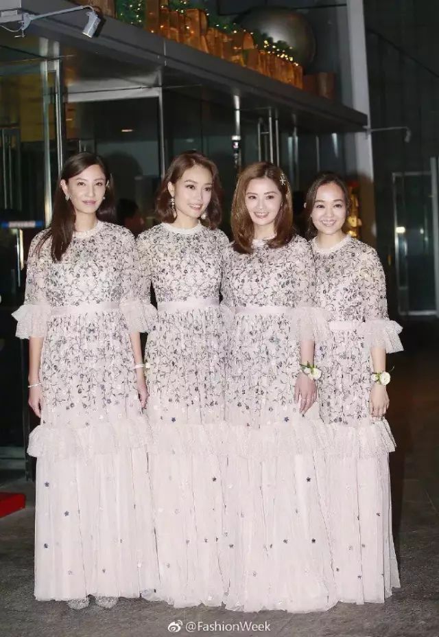 蔡卓妍、容祖儿、郑希怡作为伴娘团出场,伴娘们的礼服每次都是大家关注的焦点,这次的伴娘服上身是贴身设计,勾勒着鲜花刺绣,下摆拼接了飘逸的白色纱裙。