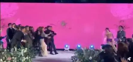 亲友们都入场之后,婚礼也即将进入最重要的时刻啦!美丽的新娘阿娇换了一身蕾丝刺绣镂空婚纱,英皇老板杨受成陪伴她步入现场,将她交给赖弘国。