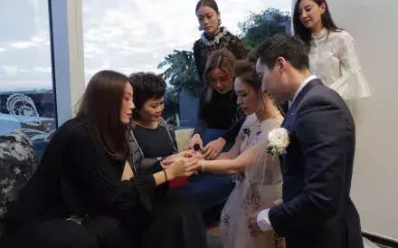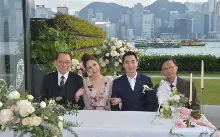 现场只限新人的亲属和朋友进入,共有30多位亲友到场见证。罗家英、汪明荃、李克勤、任达华、谭耀文、钟镇涛、苏永康、温碧霞、张智霖、袁咏仪、杨丞琳、薛凯琪、刘璇、何超莲、吴千语等明星陆续现身,为新人送上祝福。