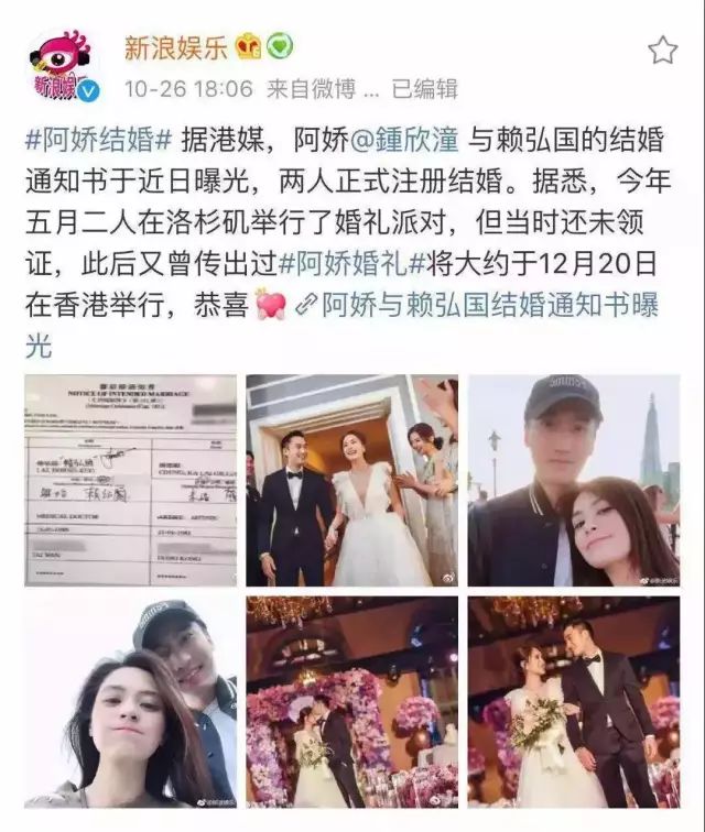 10月底的时候,据港媒报道,阿娇和赖弘国正式注册结婚,看来注册的时间有所推迟,盛大的婚礼也需要更多的筹备时间。
