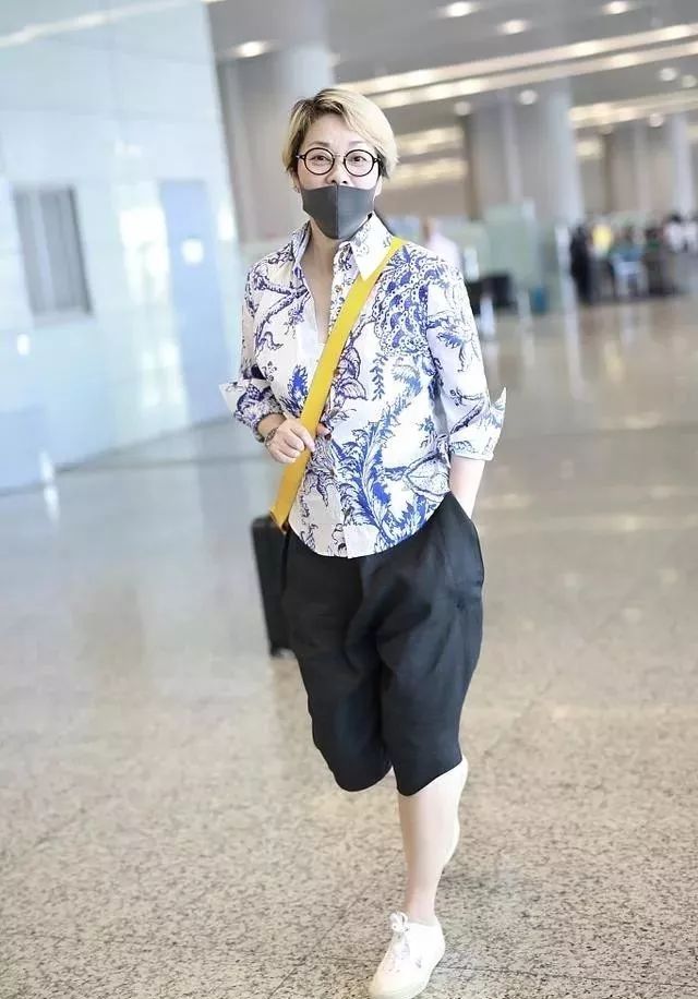 除了染成金色的短发,用来修饰脸型的镜框、颜色鲜亮活泼的包包以及哈伦短裤,都衬托了毛阿敏赶潮流的年轻态。
