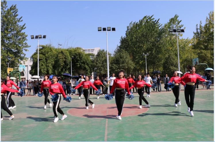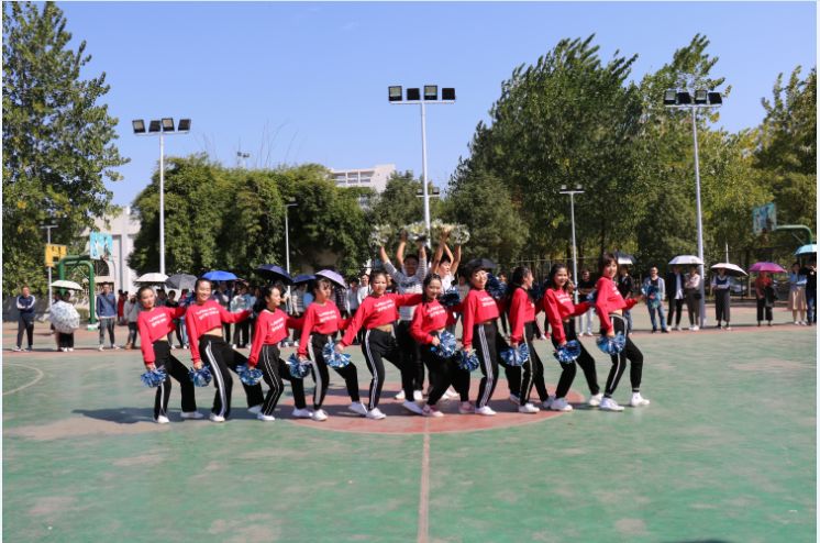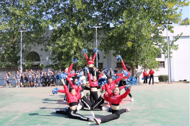当天校啦啦队的小哥哥与小姐姐也来到现场为双方队员加油打气,随着节奏欢快的伴奏响起,啦啦队队员依次入场,动感的音乐,精彩的舞蹈,欢呼声此起披伏,现场的气氛异常火热!