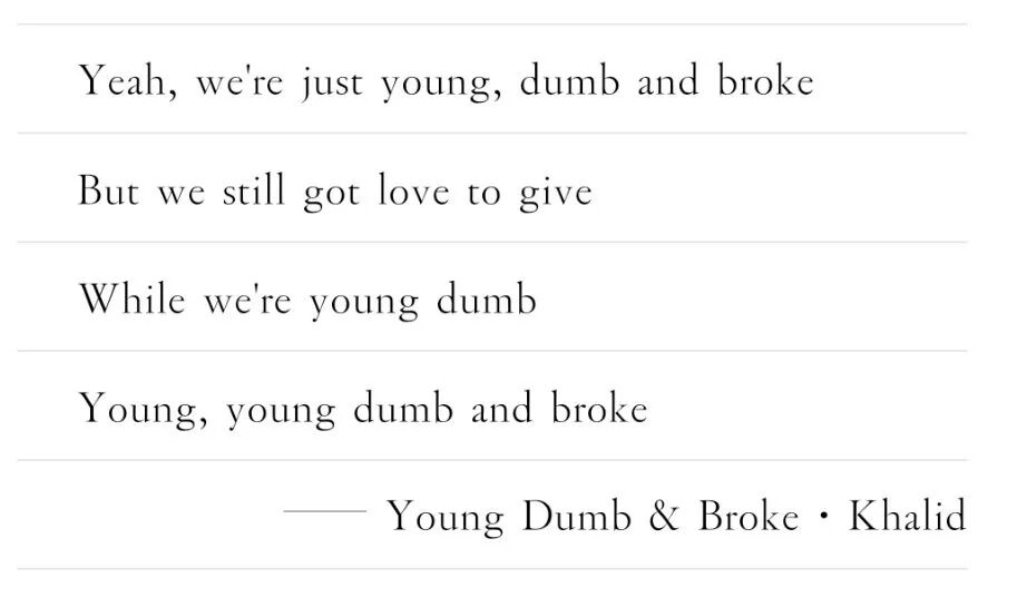 一首不一样的黑人音乐,让人上瘾的旋律,让人上瘾的又颓又痞的男声,让人上瘾的简单歌词。是的,我们年轻,无知并且身无分文,但我们仍然可以去爱。这就是最幸福的资本,最值得炫耀的资本这就是年轻的我们的年少轻狂。