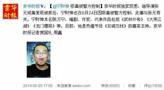 6月24日18时许,北京市公安局禁毒总队会同朝阳分局,在朝阳区工体北路一公寓内将涉嫌吸食毒品的宁财神查获,并从其办公桌抽屉内起获一小包冰毒,以及吸毒工具等。尿检结果显示,宁财神尿检呈毒品冰毒阳性。经审讯,宁财神对吸毒事实供应不讳,据他供述他有7个月的吸毒史,而这7个月里,他共分三次购买毒品,每次1000元,买了三次,每次大密度写作的时候就会吸毒,每次吸食大概200元的量,而被抓前他刚刚吸完毒。