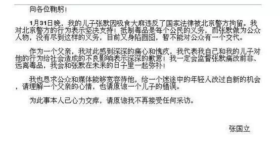 2012年1月30日晚,北京顺义警方接群众举报,位于顺义天竺一别墅区内有人吸毒。警方接报赶至,当场抓获两名涉嫌吸毒人员,其中一人为张国立的儿子张默,所吸食的毒品为大麻。消息一出引起了巨大的关注,有记者第一时间联系了张默的父亲张国立,听闻消息后张国立十分震惊,连声问:“怎么会有这种事?”而对于“张默已吸毒多年”的传闻,张国立则坚决否认,“不可能,从来不知道这事。”然而随着事件的明朗,对于张默吸毒的传闻,张国立发表声明予以证实,并且向公众道歉。他自称感到深深的痛心和愧疚,并恳求媒体能够宽容对待张默,体谅一个父亲的心情,给年轻人一个改过的机会。这也是张国立在2003年张默殴打女友童瑶之事被曝光以来再次出面替儿子认错求情。