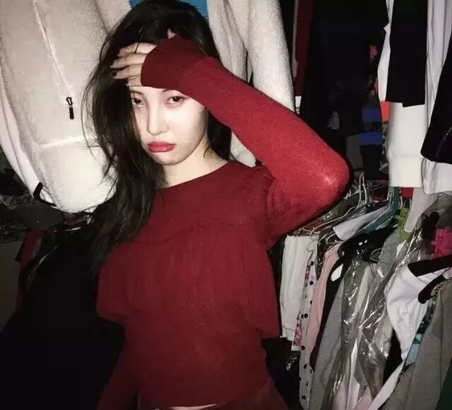 ▲下衣失踪也玩得很溜,红色卫衣活泼显白,胸以下都是腿说的就是金泫雅本人了。