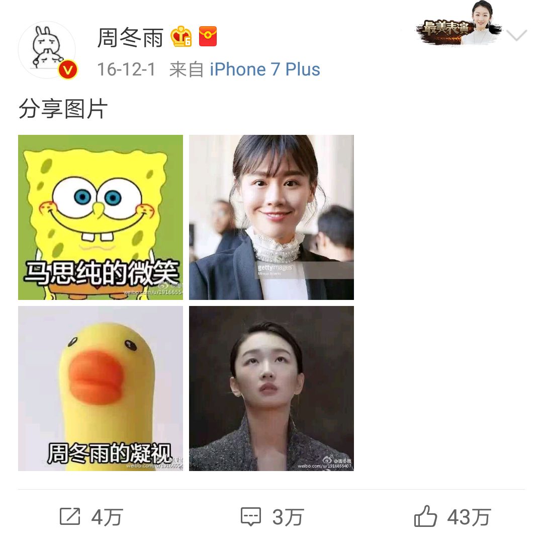 现在周冬雨微博照片里的自己,就是个从异常神奇的角度,去硬凹造型的古怪少女,在自黑道路上越走越远。