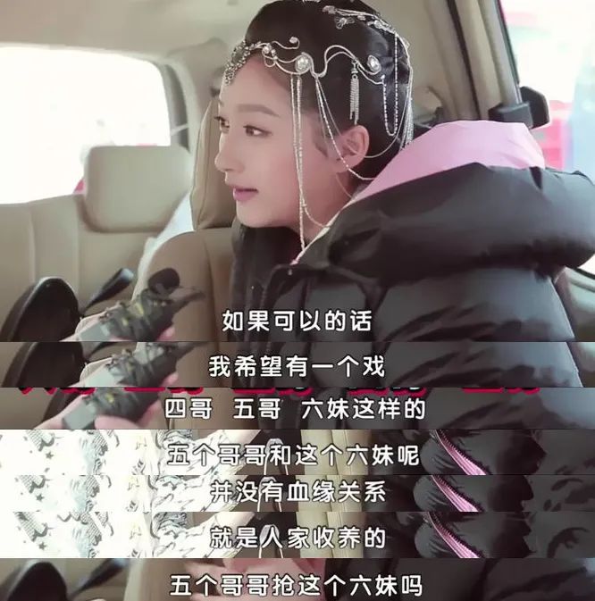 “如果可以的话,我希望有一个戏,就是有大哥、二哥、三哥、四哥、五哥、六妹这样的,五个哥哥和这个六妹没有血缘关系,是人家收养的,五个哥哥抢这个六妹。”