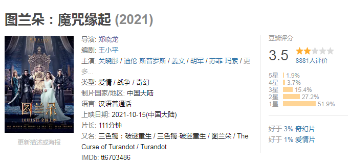 如果说《小时代》系列的口碑两极分化,那么最近上映的《图兰朵:魔咒缘起》则获得全网高度一致的评价。毫无疑问,烂片家族又添一员猛将。