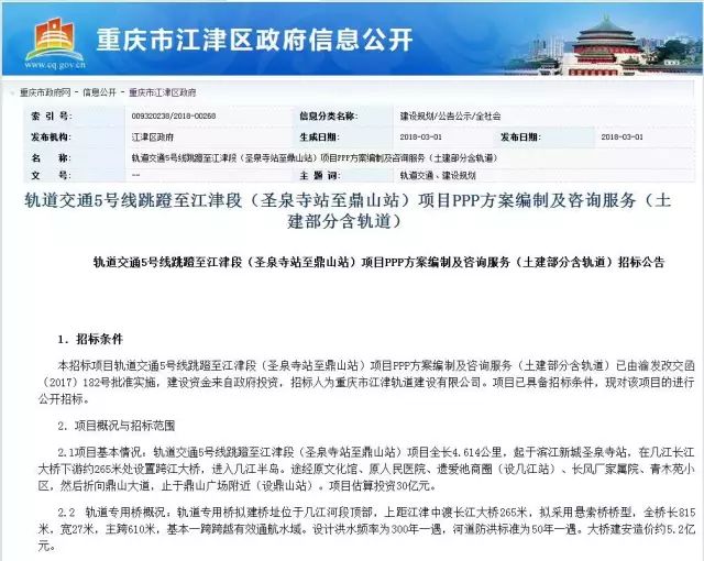 来自江津区轨道交通建设指挥部办公室的消息,江津区组织完成了新建市郊铁路(轨道交通5号线延长线)跳磴至江津线(圣泉寺站至鼎山段)项目线路方案设计,该方案已通过相关程序审查。
