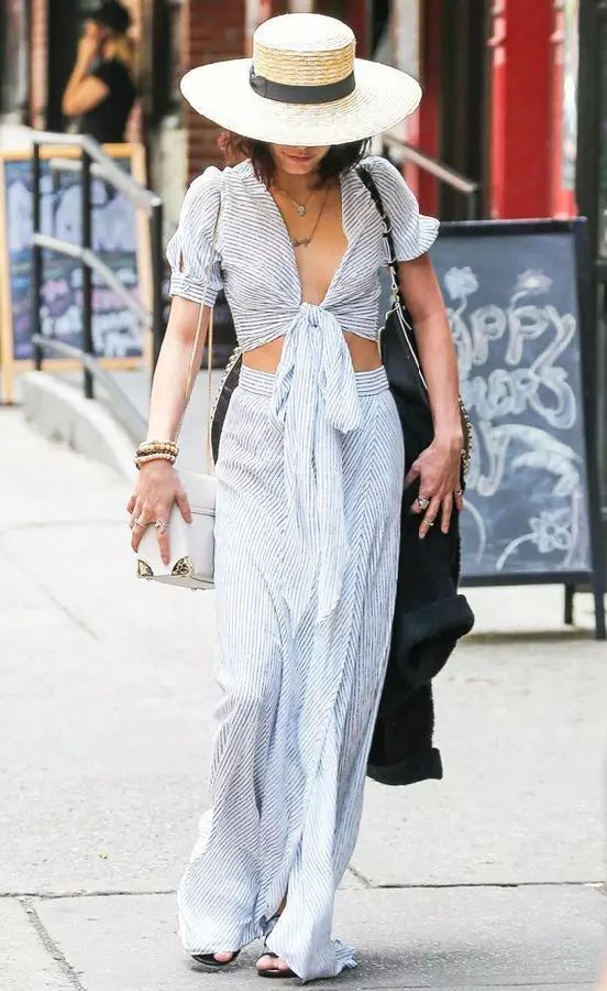 Vanessa这一身套装crop top+阔腿裤加上一个草帽,超级有度假feel。▼