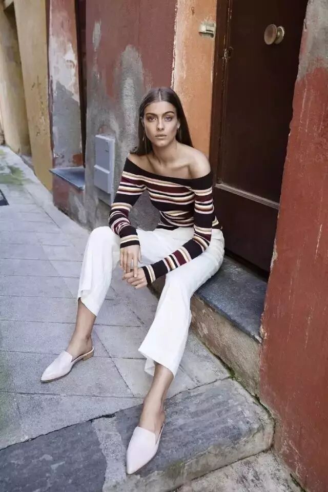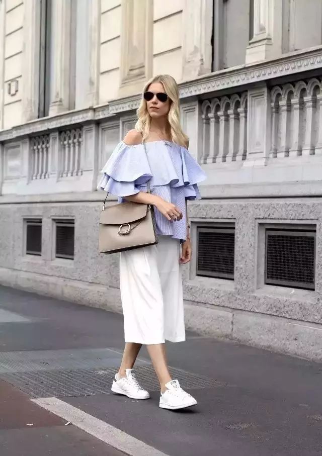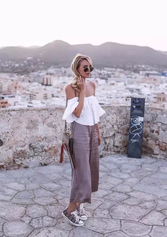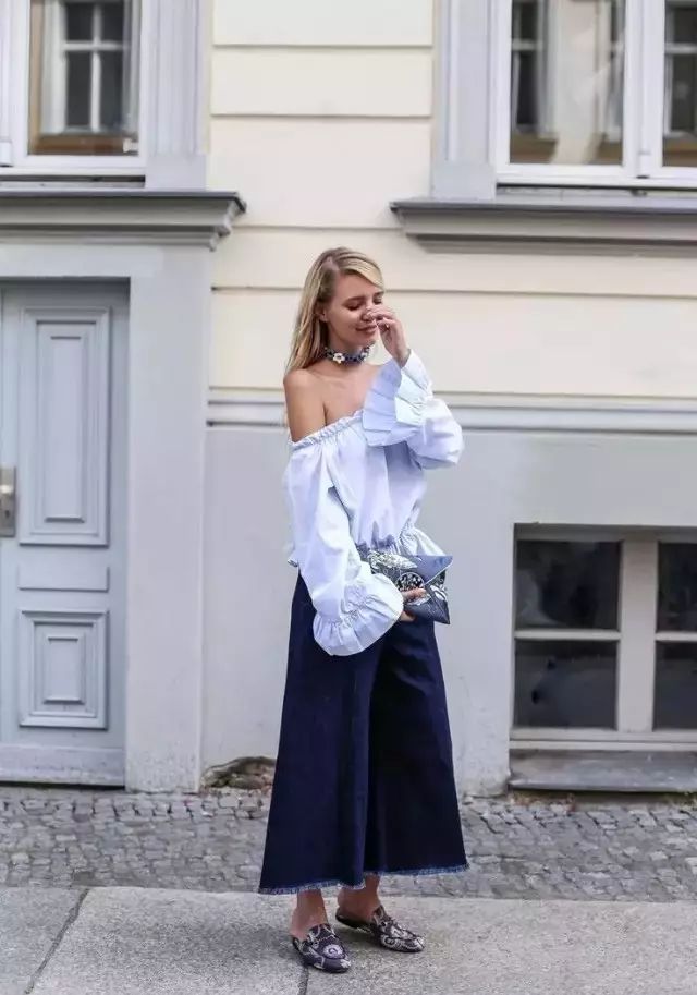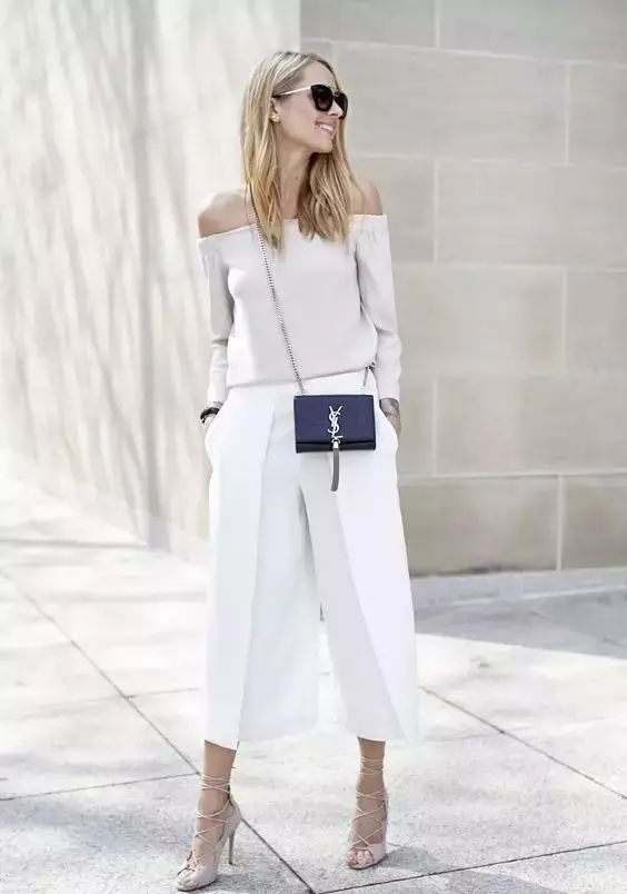 每年必火的露肩装+阔腿裤的组合等于把时髦的单品都凑齐了,你负责微笑就好,谁还能比你好看。▼