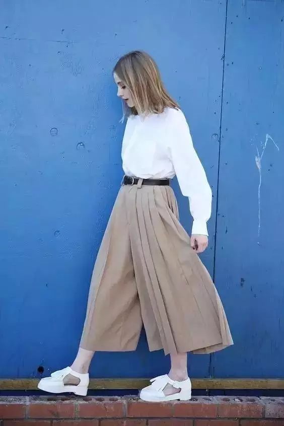 刚开始穿阔腿裤建议从超宽版型开始尝试,就当裙子一样来搭配。▼