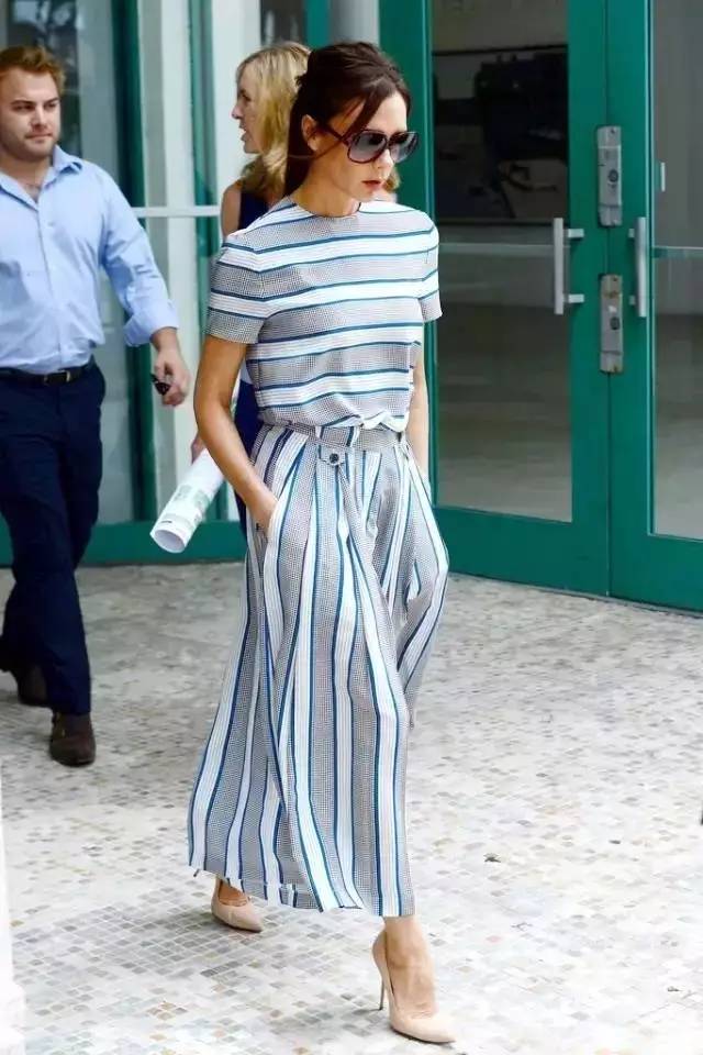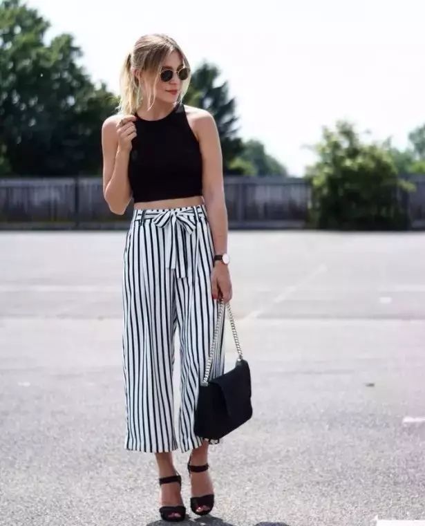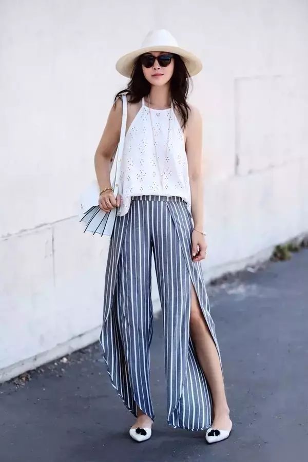 今年大热的条纹元素和阔腿裤相结合也非常的好看,竖条纹又能帮助显瘦,也可以选择开衩的款式更加chic哦。▼