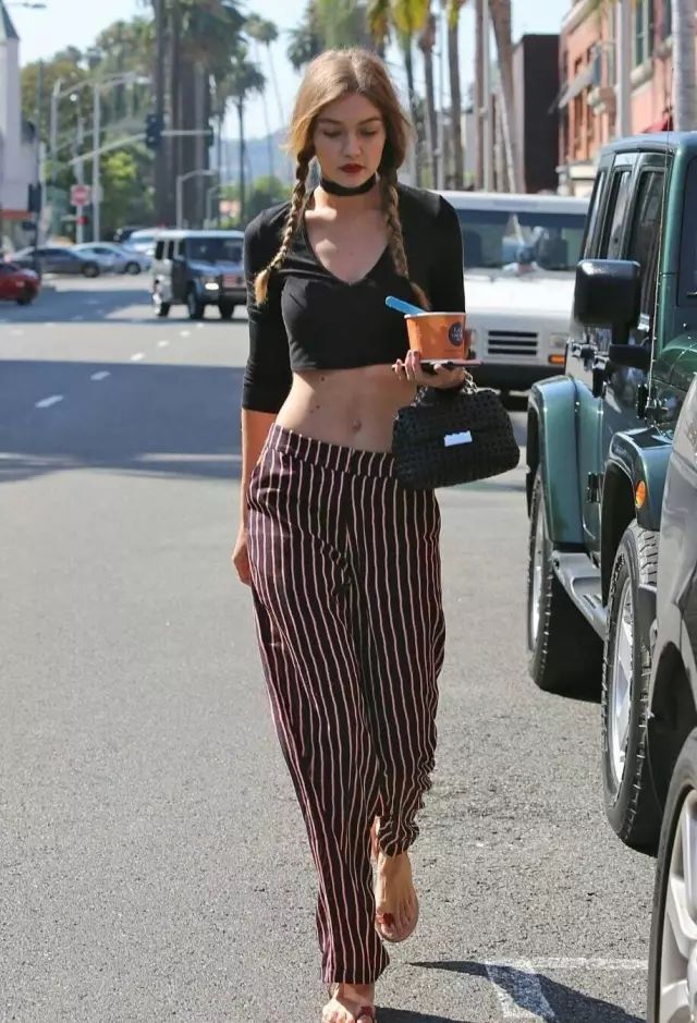 Gigi Hadid选择V领黑色短上衣搭配条纹阔腿裤,梳了个双马尾辫的她酷劲中带着少女感。▼