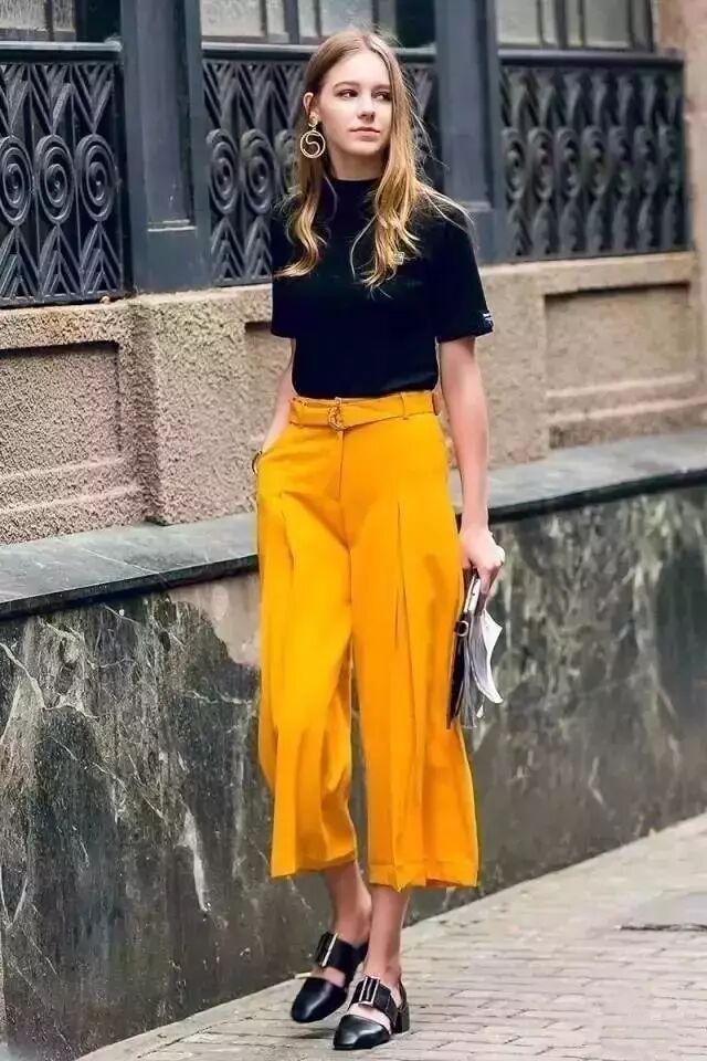 亮色系的阔腿裤非常的抢眼。▼