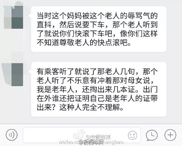 2日,合肥11路公交车上。一老人要求一个独自坐在座位上的小朋友让座。小朋友感冒了,一直在咳嗽,没有说话。然后老人就对着小朋友辱骂,小朋友母亲被老人辱骂气的发抖,说要下车。老人听到了以后说:你们快滚下车吧,不知道尊敬老人快点滚吧。