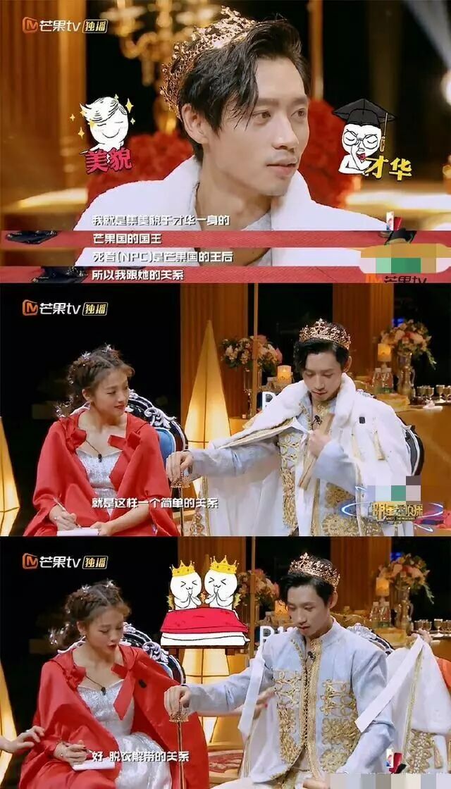 举栗子,魏晨介绍人物关系时说:“我是集才华与美貌于一身的芒果国王,NPC是芒果国王后,所以我跟她的关系,就是这样一个简单的关系:脱衣解带的关系。”