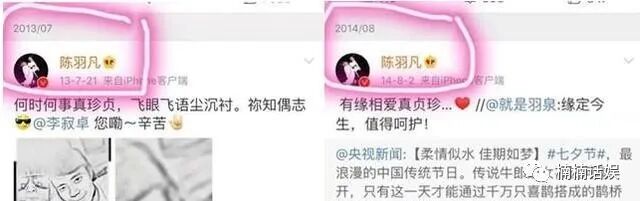 微博上显示,陈羽凡早在2013年和2014年分别发文“何时何事真珍贞,飞眼飞语尘沉衬”,“有缘相爱真珍贞”。