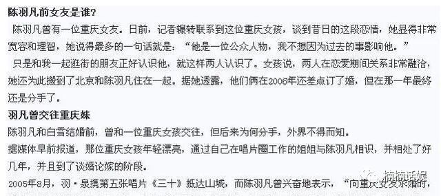 据说,曾有媒体找到了陈羽凡的前女友求证,前女友说了一句耐人寻味的话:不能说、不敢说。如果说出来了,会非常伤害人。