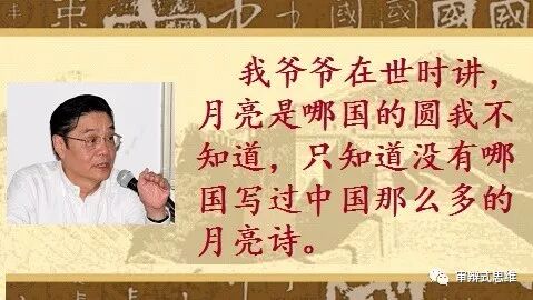 我想起了爷爷。爷爷在世时讲,月亮是哪国的圆我倒不知道,只知道没有哪国写过中国那么多的月亮诗。中国人写月亮,最美的长诗是在唐朝。最美的短诗也是在唐朝,那是中国鄙夷万邦的朝代;那时英国不要说没有诗、连他们的语言都还没有问世。所幸唐诗的诗意至今还存留在有文化的中国人的血液里,我们无论走到哪里,看到月亮就想起了那些月亮诗、想起了自己的亲人和故园。