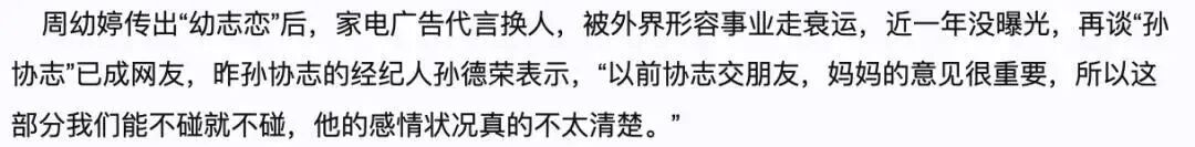 2010年当媒体再问周幼婷与孙协志的恋情时,周幼婷的语气中都略显冷漠。连孙协志的经纪人都说,他交朋友妈妈的意见很重要,所以连经纪人都知道这一块是雷区,没资格发表什么意见。