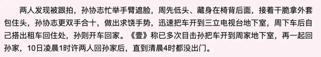 关于他和周幼婷更是怎么都不承认,孙协志和丁小芹2008年4月分手,2008年6月就曝出和周幼婷同进同出,两人就一直对外否认是朋友是朋友。两人被拍到的时候,周幼婷就藏在椅背后面,孙协志双手合十做出求饶姿势。
