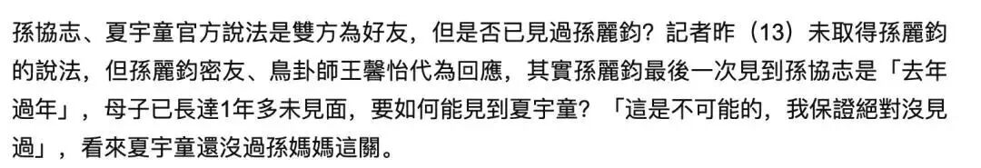 包括曝出夏宇童的绯闻的时候,孙妈妈的密友强调母子倆一年多没见面,当然女朋友更是没见过。