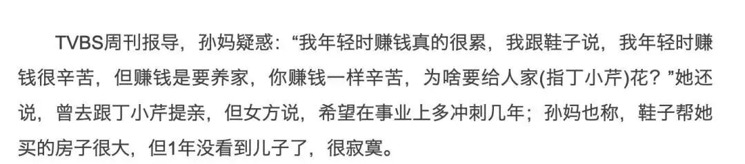丁小芹这边自己没回复,但是友人曝出母子两相处内幕。孙协志的每个月给母亲14万台币,以及还帮母亲开茶叶店。对于丁小芹完全把她当空气,嘘寒问暖全部不理。
