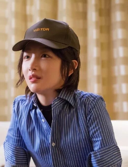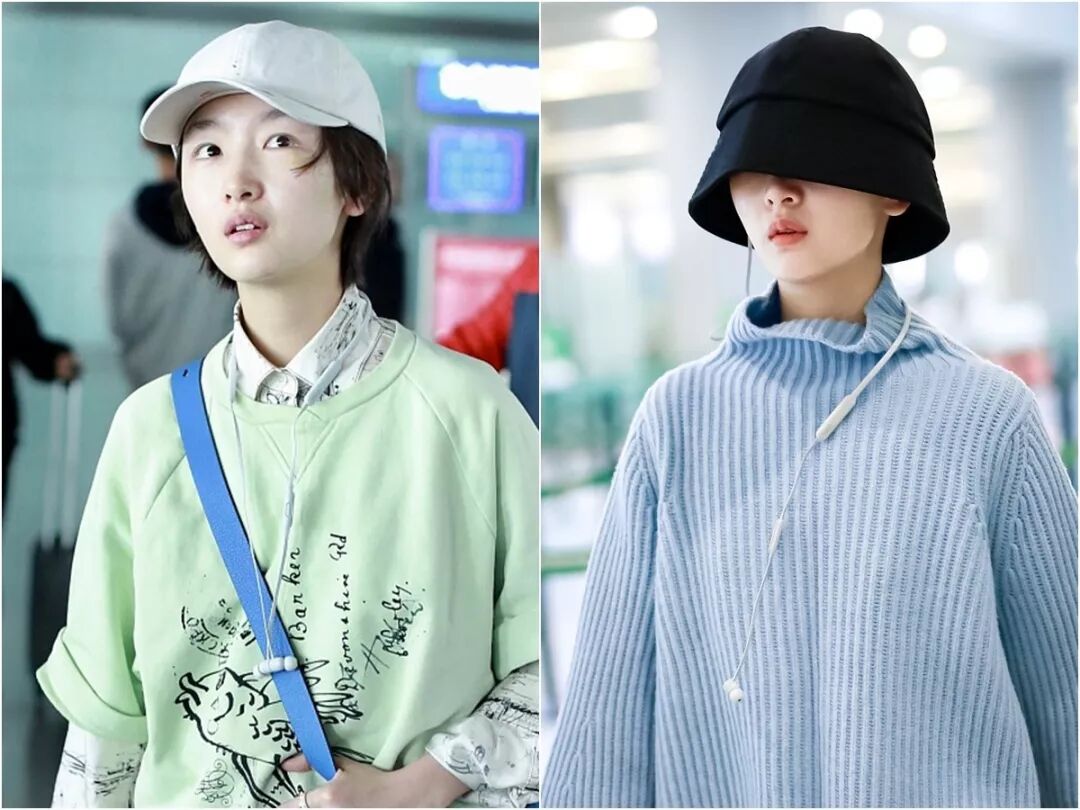 其实是因为她拍新戏剃了头,一直在戴假发。虽然这个假发和她原来的发型差别没有很大,但戴上帽子后,好看多了,时髦度也提高了不少。▼