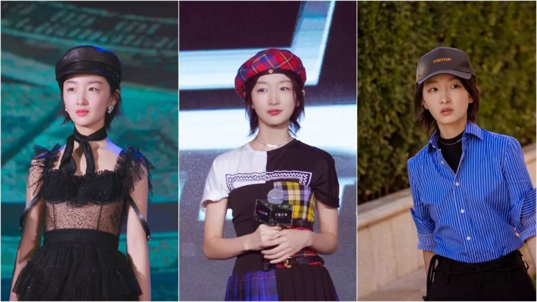 周冬雨戴得最多的是报童帽、贝雷帽,还有棒球帽。