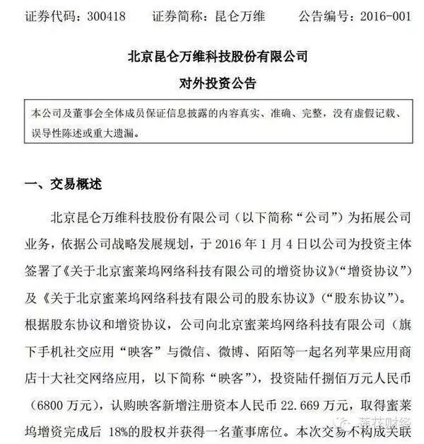 值得一提的是,目前全球范围内移动视频直播领域的投资正如火如荼,此前Facebook和王思聪的投资均涉足了这一领域。按照昆仑万维此次投资金额计算,蜜莱坞整体估值已达3.7771亿元。对于此次交易,昆仑万维表示,此次投资有利于拓展公司业务,提高公司综合竞争力,为公司增加新的利润增长点。