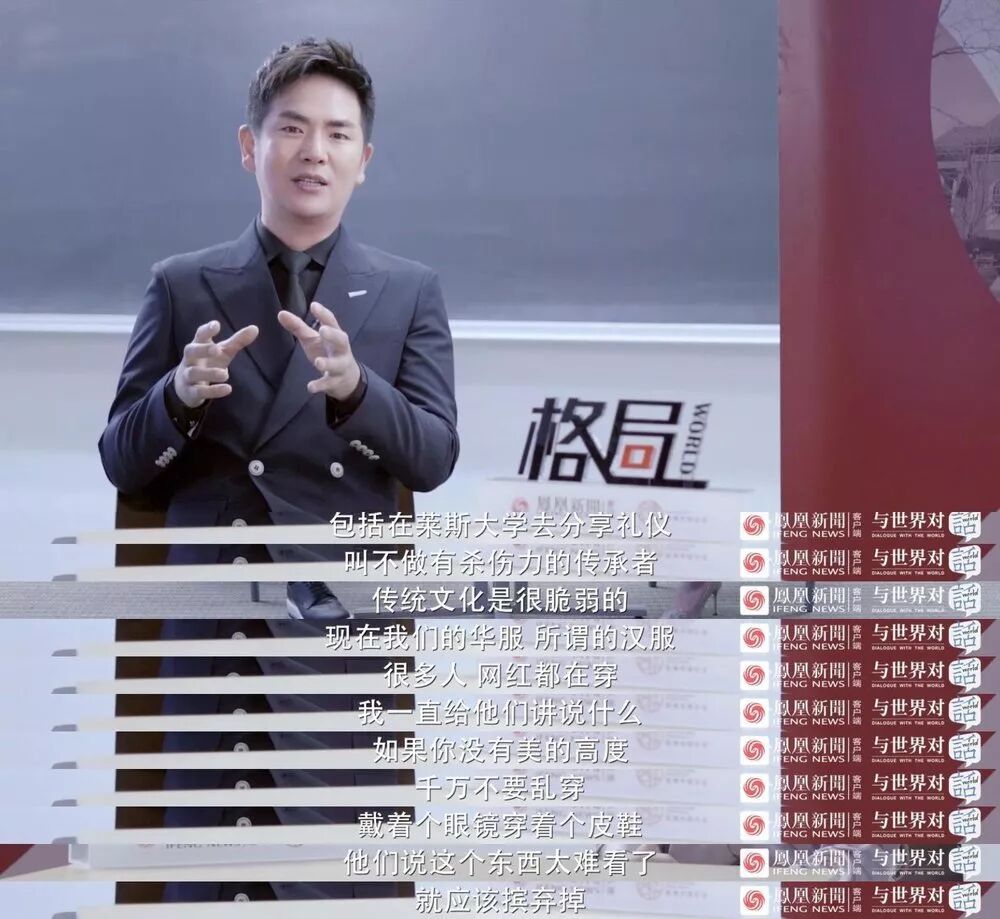 我以前就在国家大剧院,包括在莱斯大学去分享礼仪,就是很长的一个名字,叫“不做有杀伤力的传承者”,传统文化是很脆弱的,现在我们的华服,所谓的汉服,很多人,网红都在穿。我一直给他们讲说什么,如果你没有美的高度,千万不要乱穿,戴着个眼镜穿着个皮鞋,穿着一身线头的50块钱100块钱买的衣服,他们说这个东西太难看了,就应该摈弃掉。所以我觉得传统文化那么的脆弱,我们就应该有高度地去,有美学、有审美地去吸引更多人,它本来是一个脆弱的东西,所以我就一直在说,不要做有杀伤力的这样的传承者。