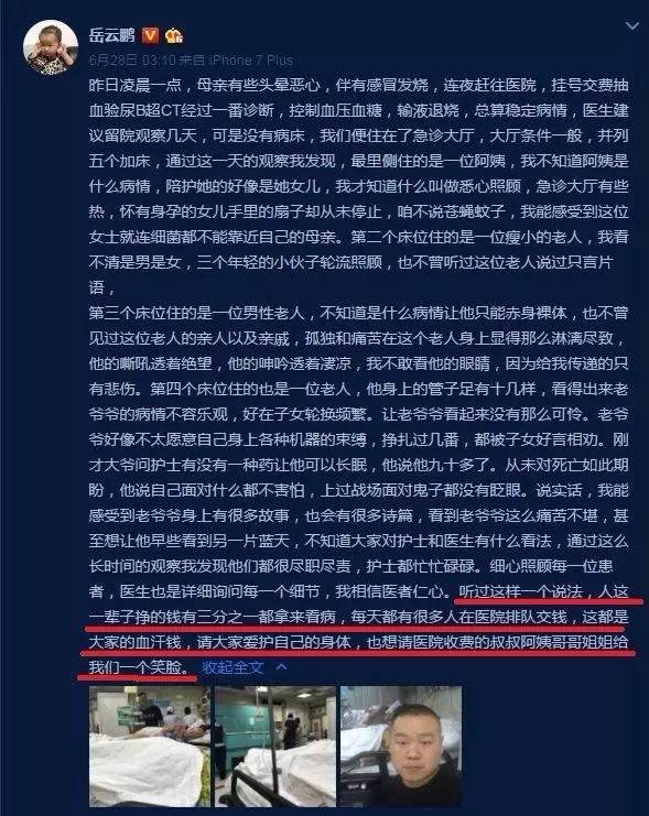 去年的6月28日,岳云鹏深夜发了微博长文,并晒出了三张医院里的照片,原来是他妈妈身体出现了一点小状况,去医院带妈妈看病,岳云鹏在微博里说道:听过这样一个说法,人这一辈子挣的钱有三分之一都拿来看病,每天都有很多人在医院排队交钱,这都是大家的血汗钱,请大家爱护自己的身体。