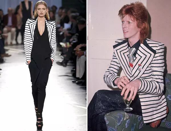 David Bowie 的华丽摇滚不仅体现在音乐上,时装更是华丽的彻底。早年的黑白条纹大翻领西装外套,就被 Ricardo Tisci 在 2010 年春夏 Givenchy 秀场上演绎过,他在 60 年代末的长发搭配宽松衬衫与高腰阔腿裤的造型,也在 Chloe 2010 秋冬的秀场上出现过。Jean Paul Gaultier 更是在 2011 年春夏秀场上,用了一整个系列的时装来致敬他。