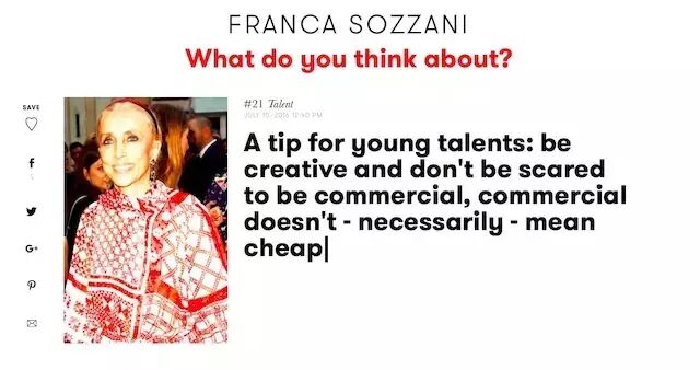 “我们只是一个信息的传送者……我们不应该变成明星,如果我们变成了明星也是因为我们做的事情而不是穿的衣服、戴的眼镜和包。”Sozzani 说,“所有的杂志都可以有相同的衣服。我们去相同的秀场,用相同的模特,如果你不改变观点的话,只会成为另一个产品目录而已。我们不需要另外一个产品目录。”