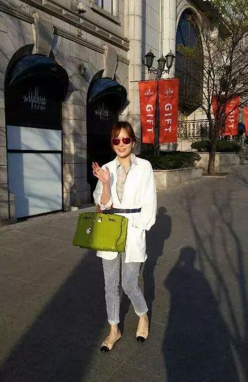 可以看出这时候的天气特别好,人也特别美,里面不是纯白色的衣服打的,反而是一件格子的衬衫,而且外面就套了一件纯白色的衣服,下面搭配的是一条牛仔的直筒裤,她的腿实在是太瘦了吧,不过最显眼的还是她手上提着的绿色包包!