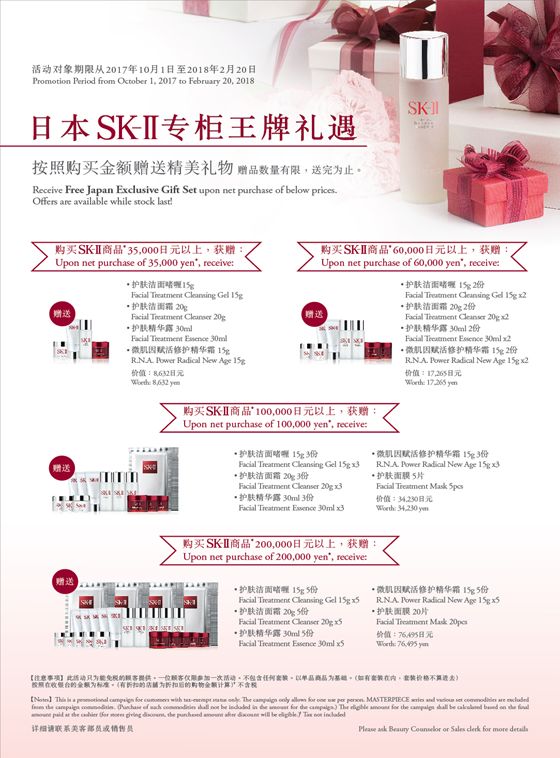 一次买满35,000日元,可以获得SK-II旅行装一套(15g的洁面啫喱、20g洁面霜、30ml神仙水、15g大红瓶各一只,价值8,632日元)。