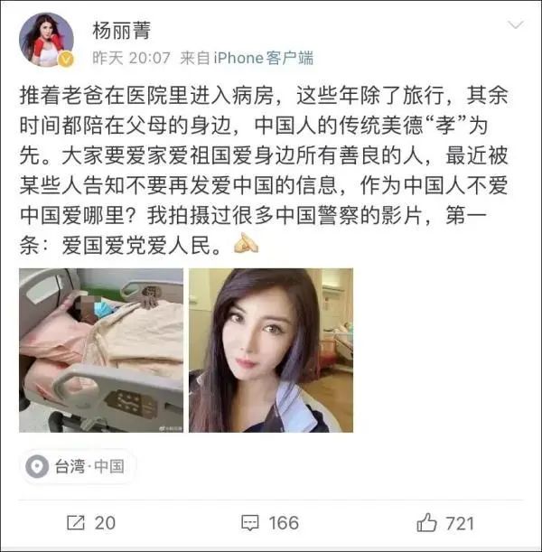 原来,杨丽菁因为经常在微博发表爱国言论,就被岛内的一些不法分子盯上了。