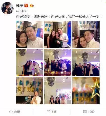 刚刚韩庚晒出一组亲朋好友为自己庆祝生日的照片,其中老妈跟女友卢靖姗都有出镜!韩庚还说了,你好35岁,谢谢老妈!你好女孩,我们一起长大了一岁!