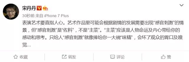 12月3日凌晨,宋丹丹还再度发文批评她们三人的表演,宋丹丹写道:表演艺术要直指人心。艺术作品里可能会根据剧情的发展需要出现“感官刺激”的情景,但“感官刺激”是“佐料”,不是“主菜”。“主菜”应该是人物命运及内心带给你的感动和思考。只给人“感官刺激”就像捧给你一大碗“味精”,会坏了观众的胃口及嗅觉。
