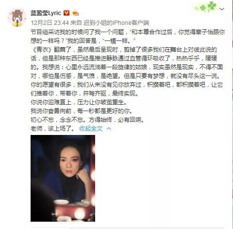 12月2日晚,节目播出后蓝盈莹深夜在微博发表了很长一段对老师章子怡的话,蓝盈莹说《青衣》已经翻篇,虽然节目中剪掉了许多她与章子怡在舞台上的对话,但是那种东西已经是推进静脉通过血管循环吸收了,热热乎乎,暖暖的。言辞间满是对章子怡老师的敬爱。
